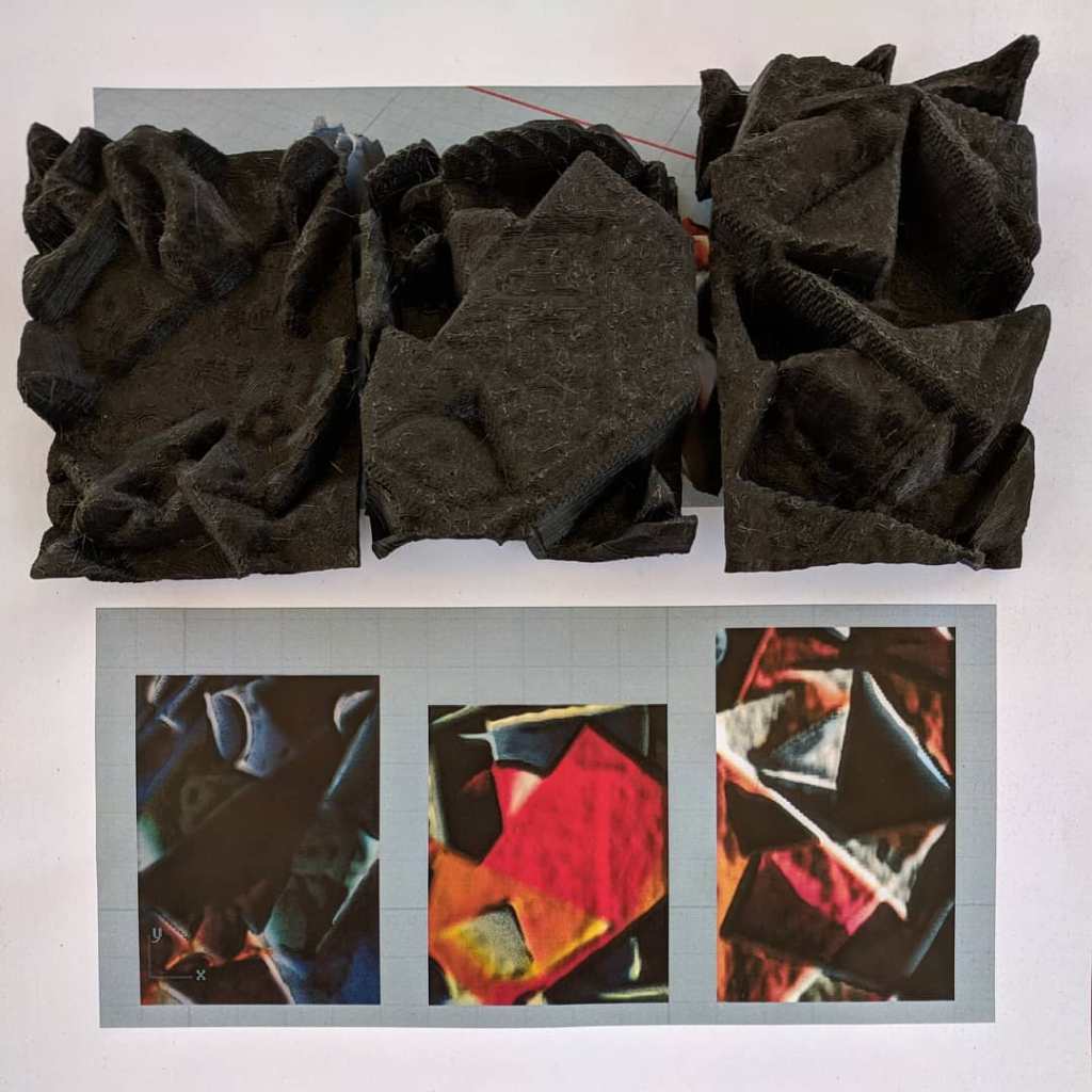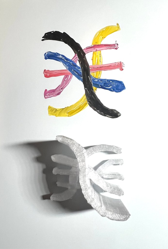 To save time and materials, the prints are in one material, translucent. It is apparent, below, how the tones of the original sketch yield height in the final print.