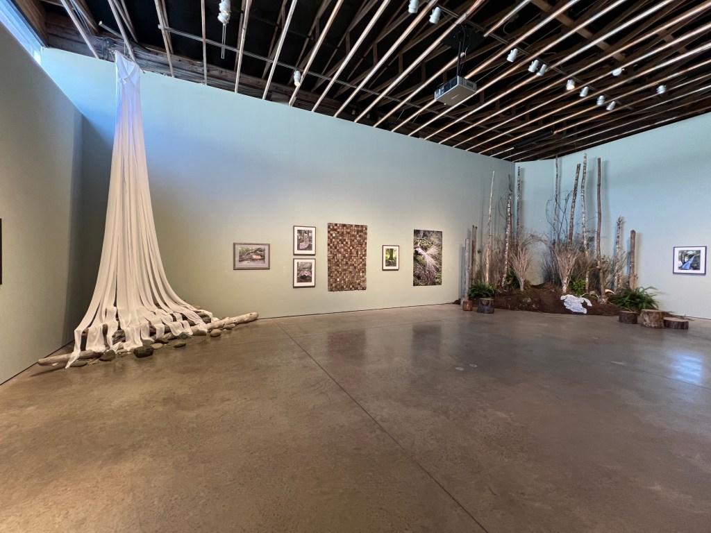 Jeanne K. Simmons’s Rooted, shows artifacts and photographs of forest and ocean settings, with a woman enshrouded in clothes made of natural materials. For instance, there are images of a woman in the woods cloaked in a cloth made of bark tiles sewn together. Or there is a woman perched above on a small cliff, in a fifteen foot long streaming cotton shirt, flowing in strands downward like water, to below. Or a woman is mermaid-seeming, swimming in the ocean in a dress made of kelp leaf strands. Or the woman is in a skirt sewn of twig branches. Some clothing items made of Nature that the woman is photographed in are present in the gallery.