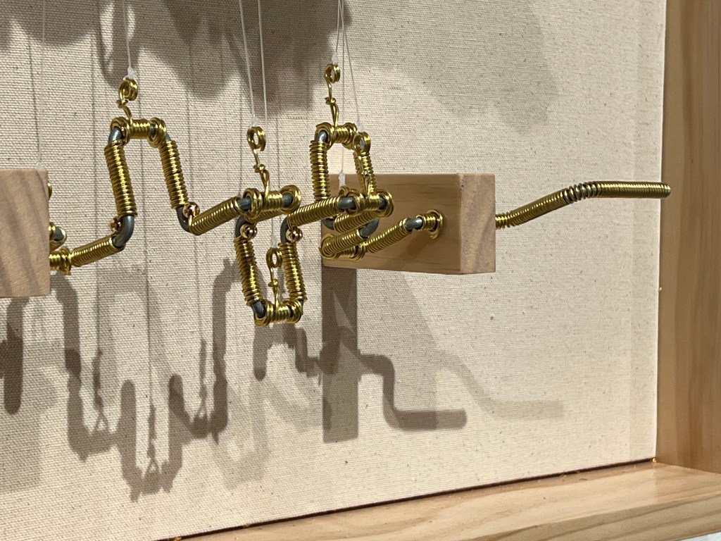 On my first visit I walked briskly through the Tidal Sky gallery and the work did not register until one of the docents suggested I twirl one of the handles on the work. (see illustration) Unfortunately, I cannot post video on this web log, would be nice to show you how the work has very subtle and charming movements.