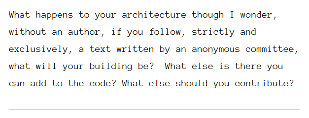 What happens to your architecture though I wonder, without an author, if you follow, strictly and exclusively, a text written by an anonymous committee, what will your building be? What else is there you can add to the code? What else should you contribute?