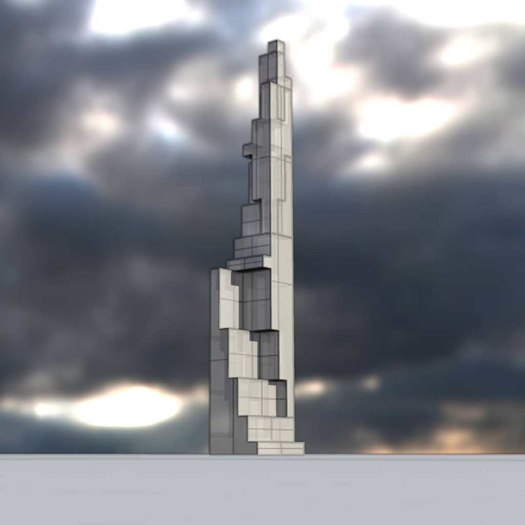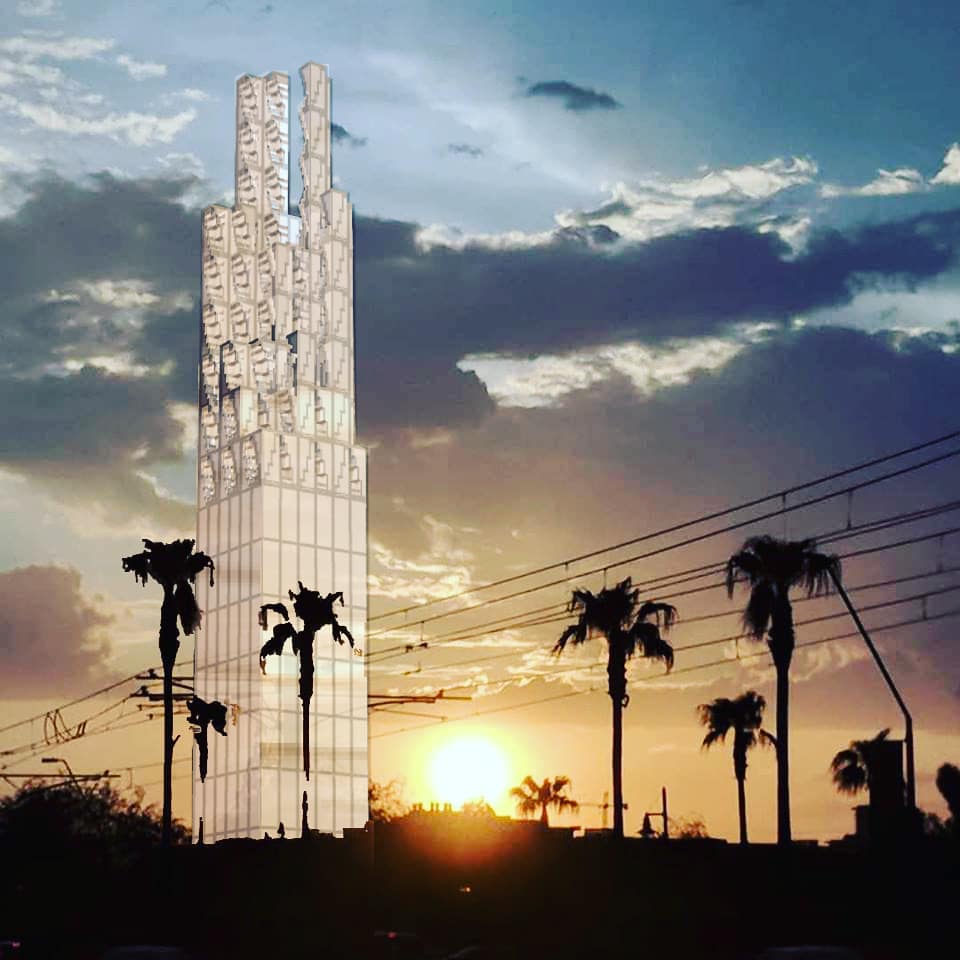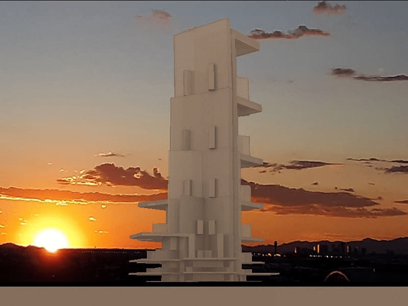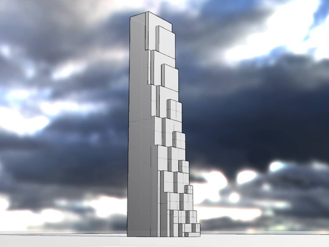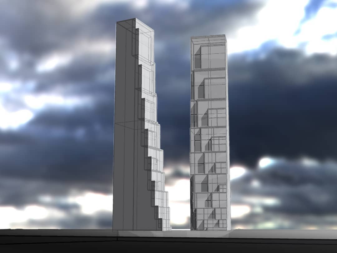 This sequence of drawings were made very quickly at the very end of January and very beginning of February 2019. These should file under “portfolio”. The example above and some below blocks carved out for air and solar exposure. The main tenets that drove these are 1) articulate massing to bring in natural air and solar, 2) variations in the spaces should be apparent in the elevations, 3) brace frames for stability. 4) think lofty and upward. I will add a bit about each tenet, each point below.