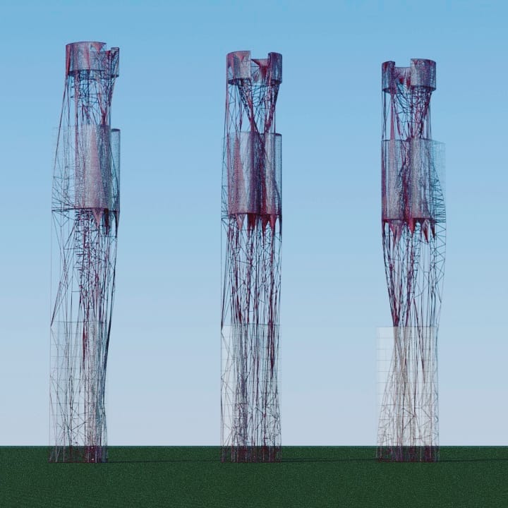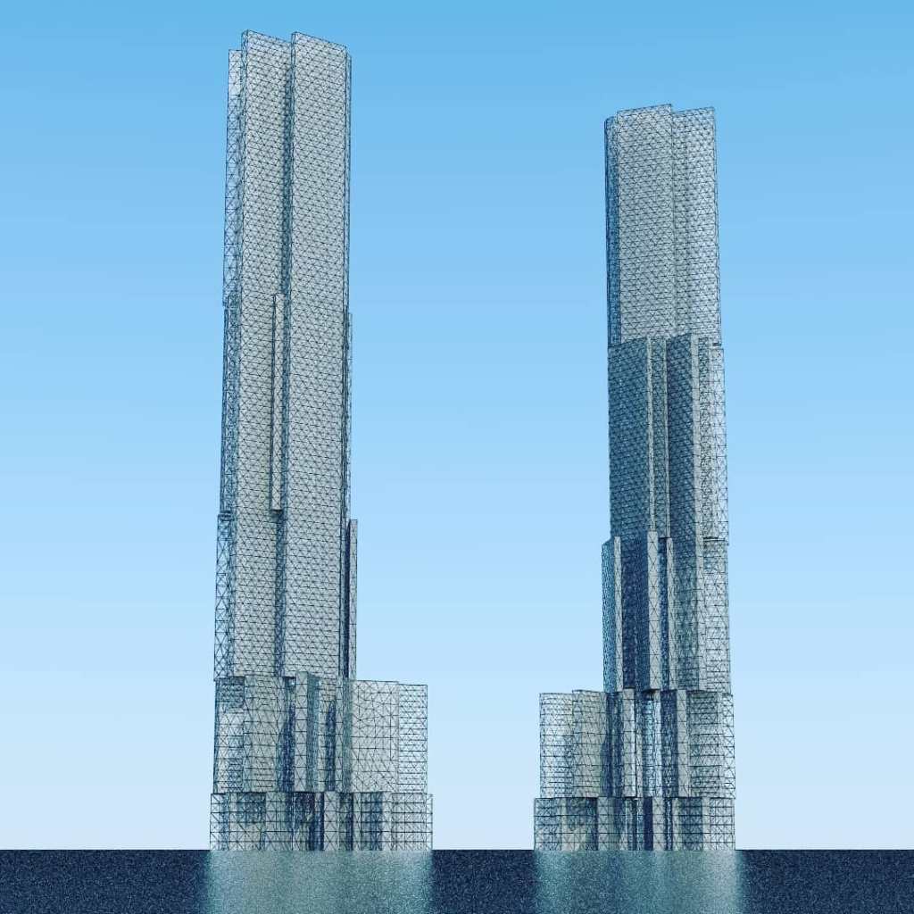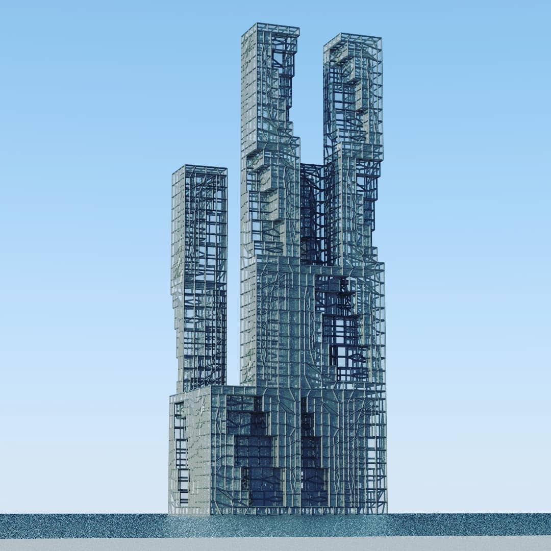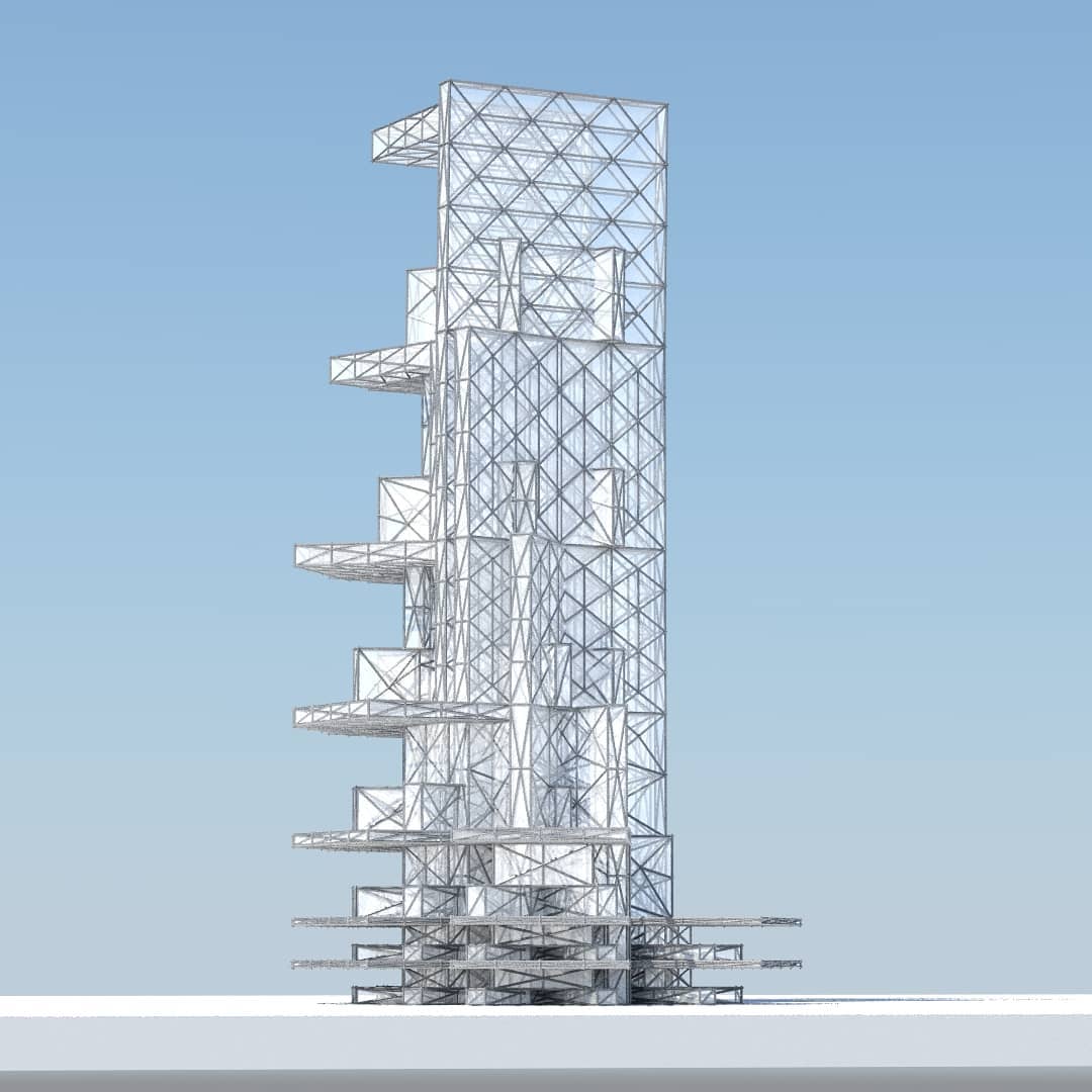 3) Some of these towers use a diagonal grid, a braced frame structure for extra stability. This might expect you to see the world less through a rectangular window and more of a triangulated or crystalline one. For example,