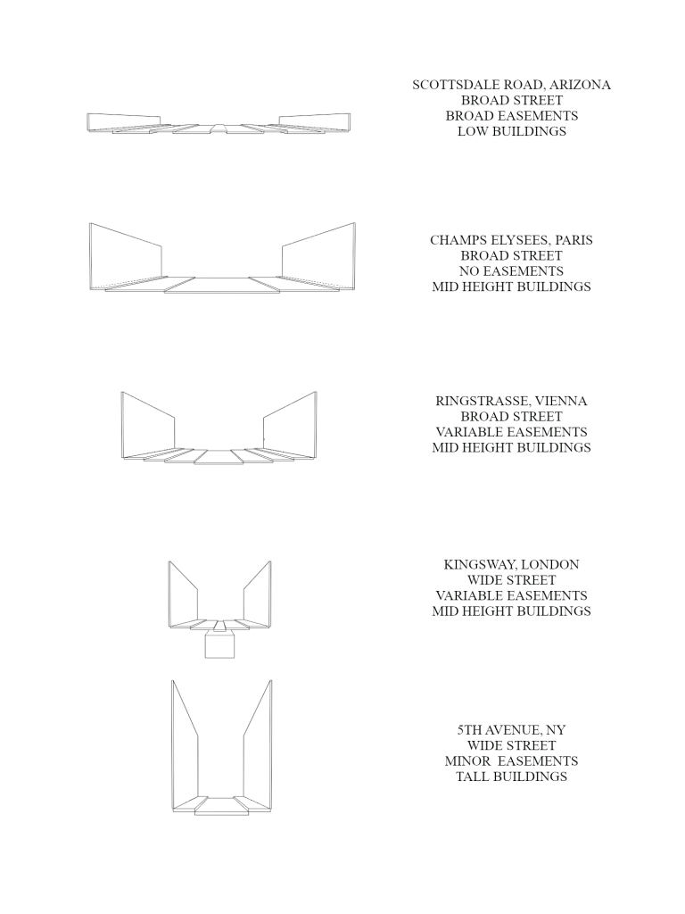 Drew these schematics the other day. Was thinking mostly about Scottsdale Road, near where I live. So many cars, not a lot of people, completely exposed to the scorching heat. There are some meagre trees and some more details and nuance but I just drew the height and width in an average.