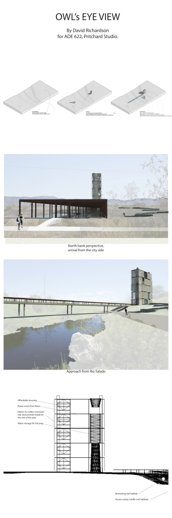 This was my final master’s degree studio at Arizona State University before joining the PhD Program. The topic was the Rio Salado in Phoenix. I chose a cite in central Phoenix on the south bank of the river. The site was selected as a way to mitigate sprawl in the city. The site was also home to burrowing owls that had been relocated there and most of my attention was on how to reconcile urban density and wildlife.